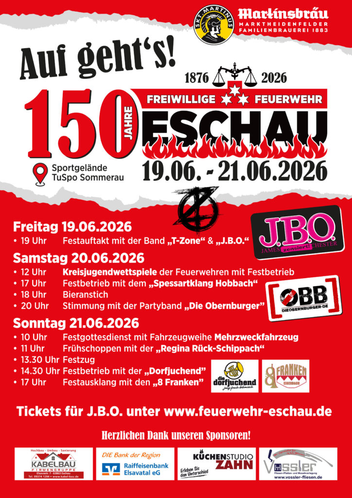 Wir, die freiwillige Feuerwehr Eschau, feiern vom 19.06.2026 bis zum 21.06.2026 unser 150-jähriges Bestehen. Zum Beginn des Festwochenende haben wir für euch einen richtigen Knaller organisiert. Zunächst beginnt die Band T-Zone und danach lassen wir es mit der Band J.B.O. richtig krachen!